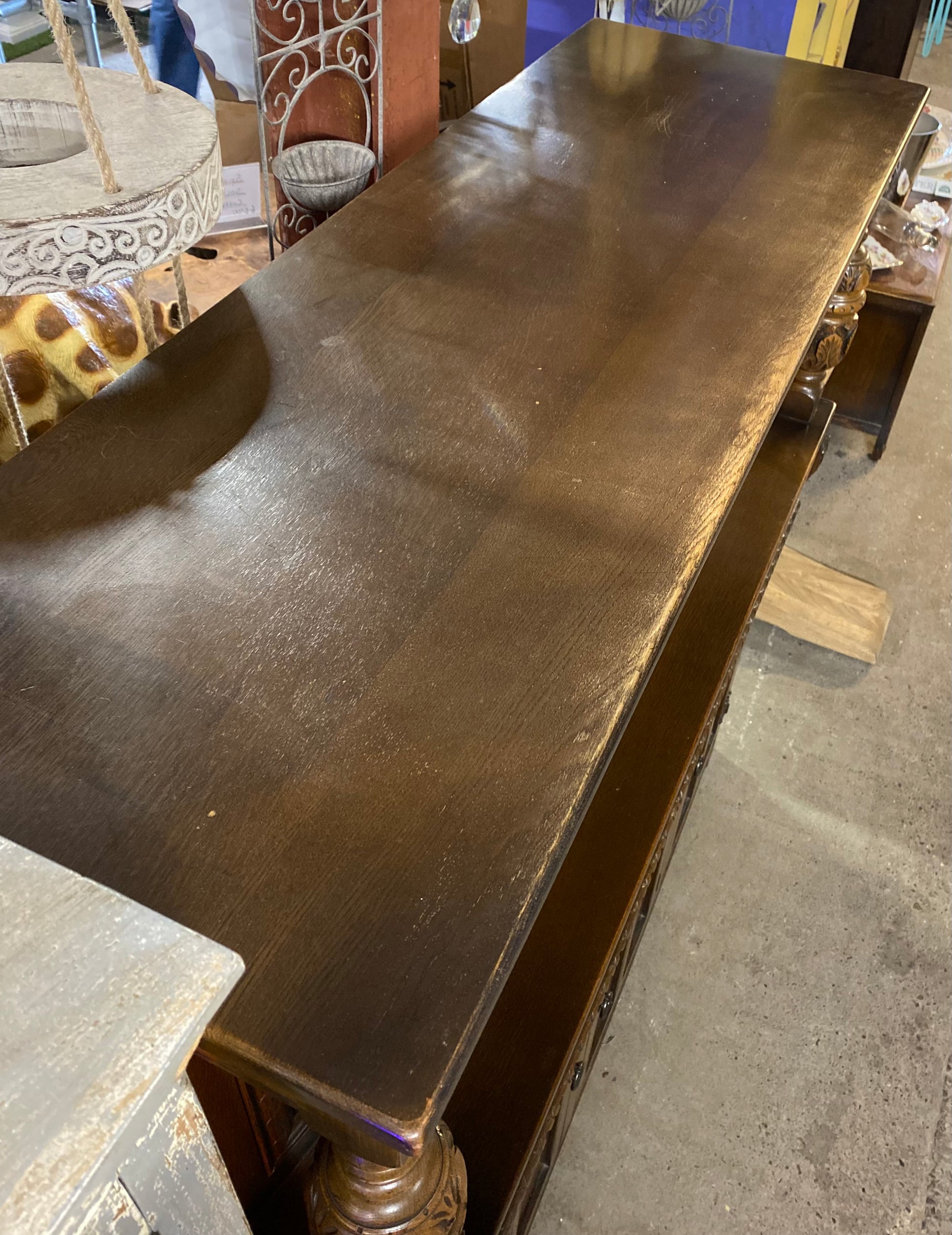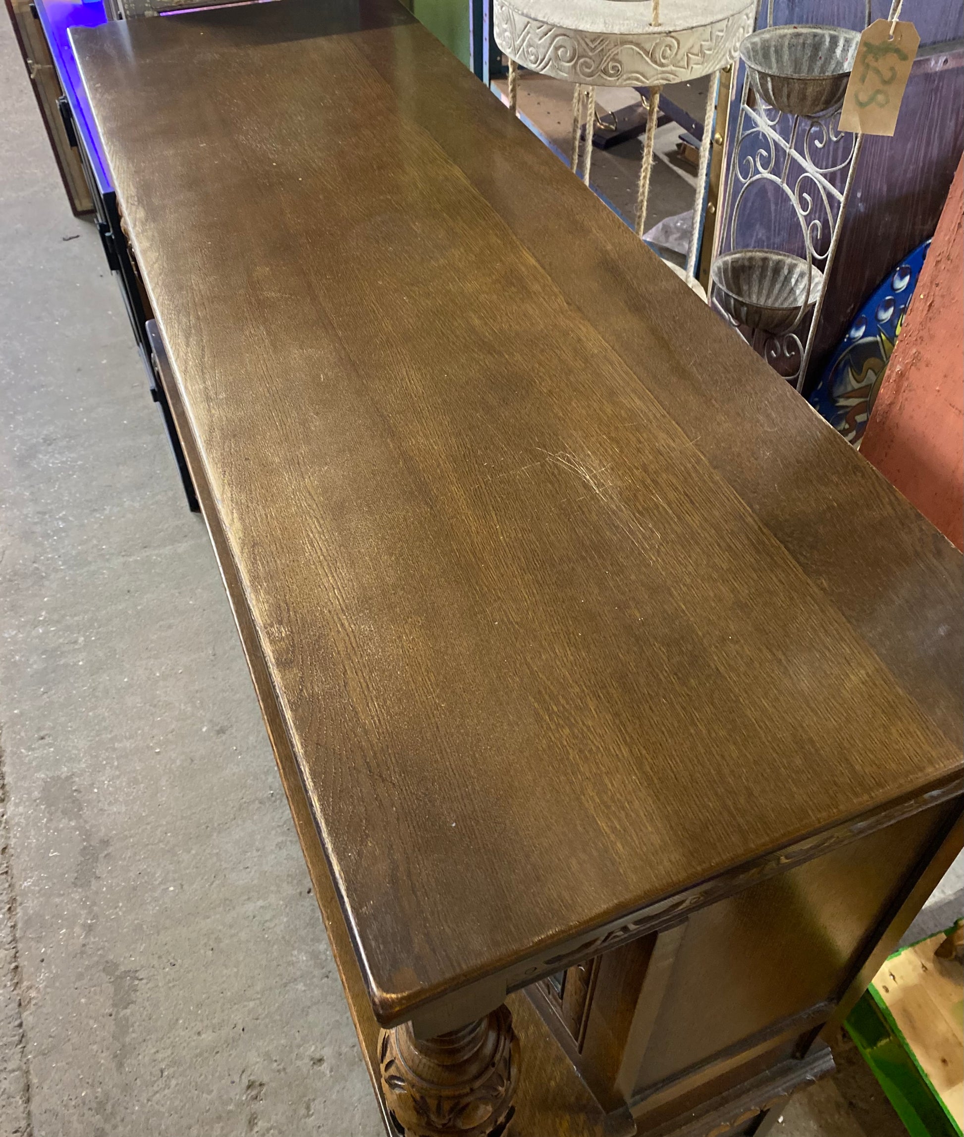 Antique solid oak tall sideboard / cabinet with ornate carvings