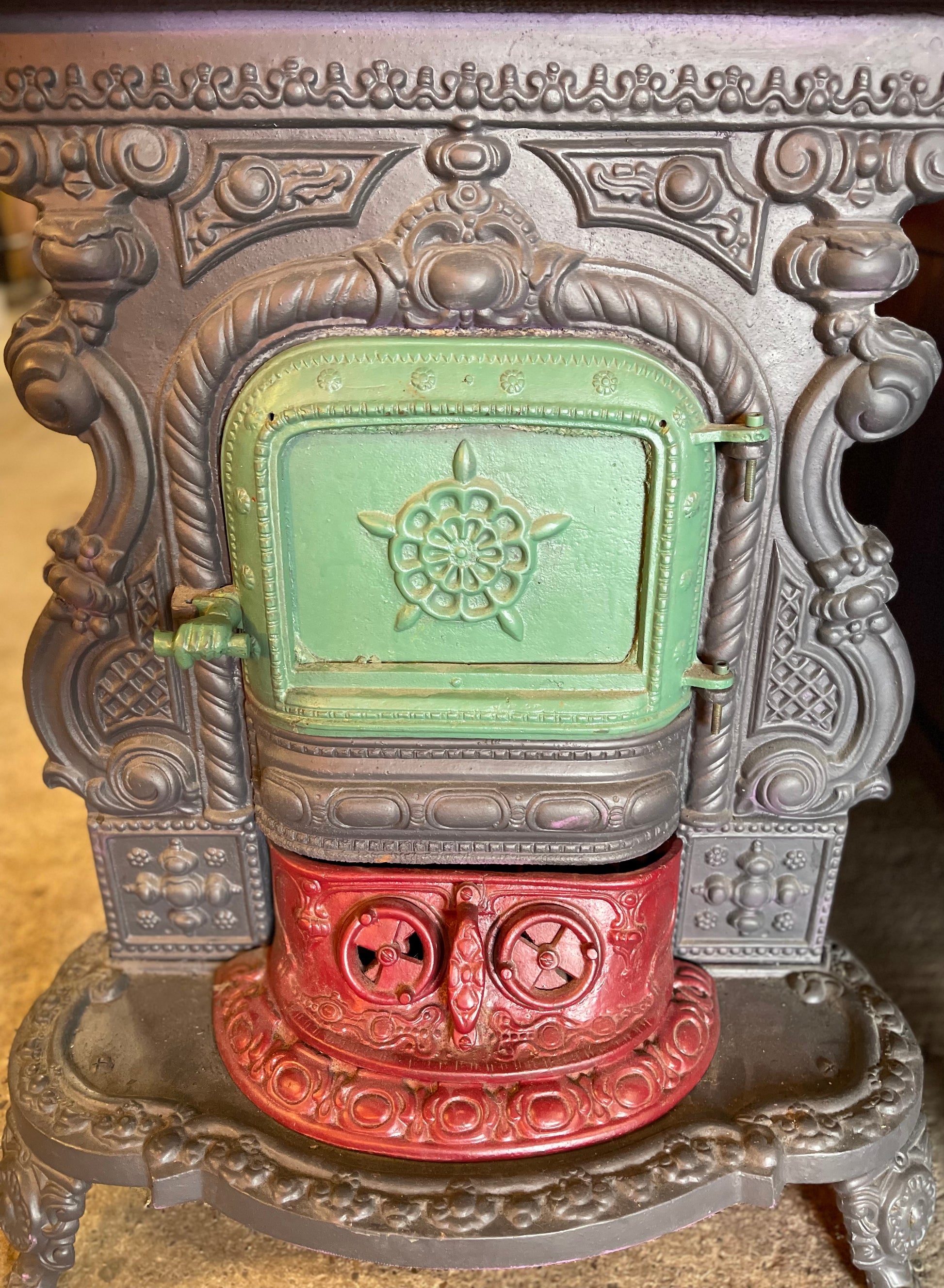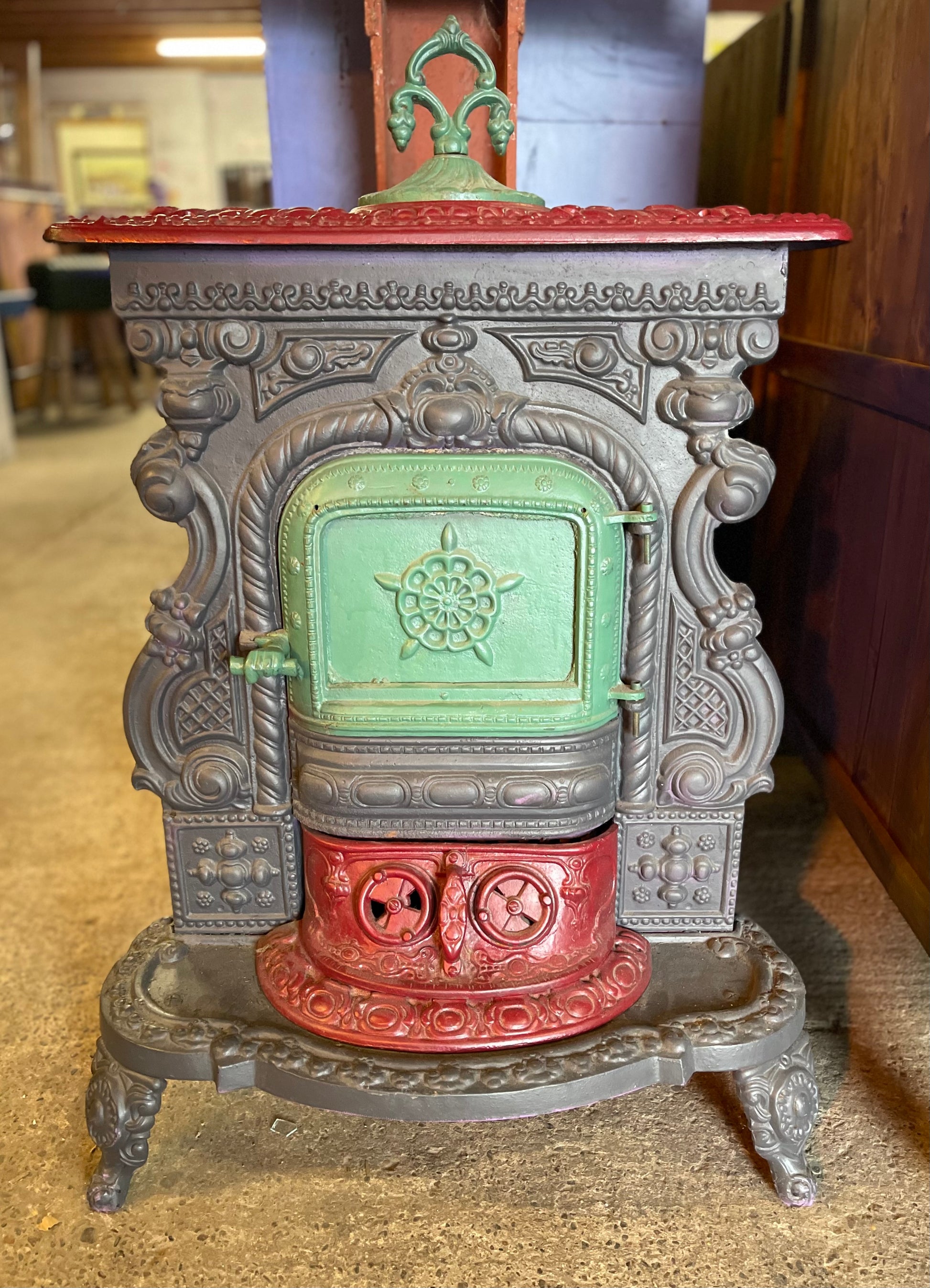 A beautiful, ornate cast iron wood / log burner, featuring a cast iron door and lid, with an interior grate and ash pan. Originally from the Norfolk area, the person we purchased this off said it worked perfectly but felt it looked too large for their fireplace area. Please note that we have not tested the log burner ourselves but understand that it is in good working order, and perfect for anyone who lives in a period property and is able to properly install the burner.