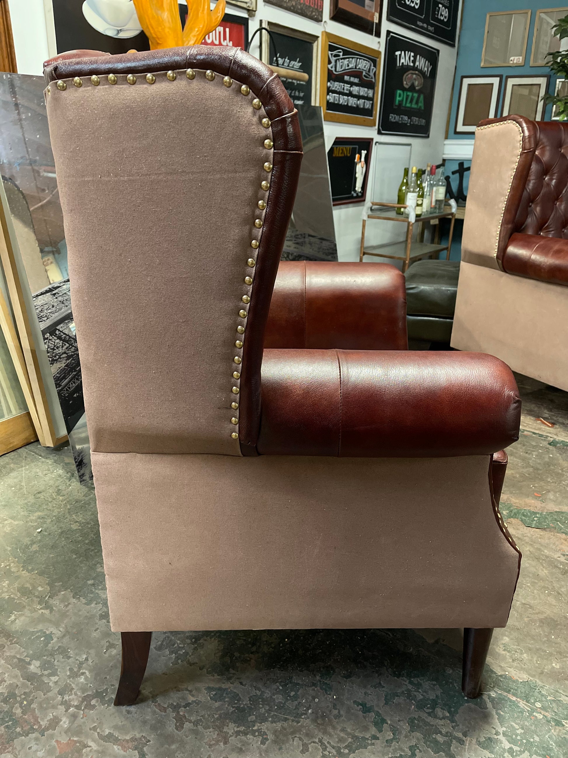 A stunning armchair in a glossy brown chestnut coloured leather. Featuring a stylish button back and brass stud detailing, with a brown fabric back and sides. Perfect to place in either a modern or more traditional style home as statement piece of furniture, that has the added benefit of being extremely solid and comfortable.