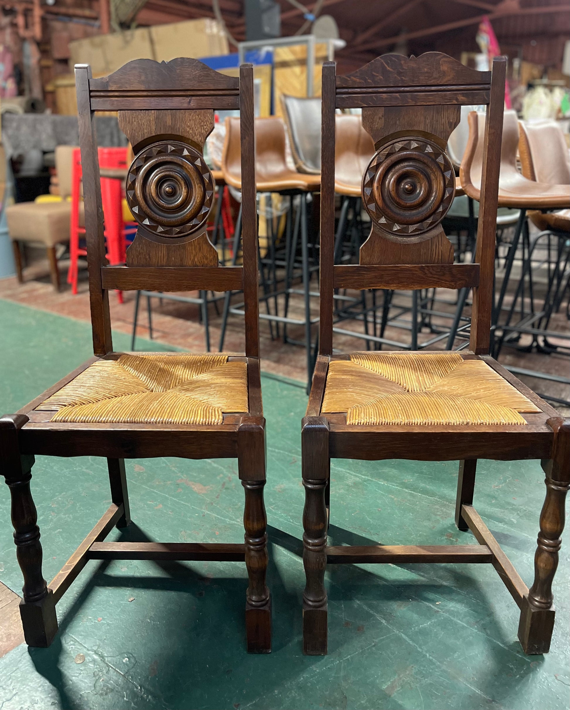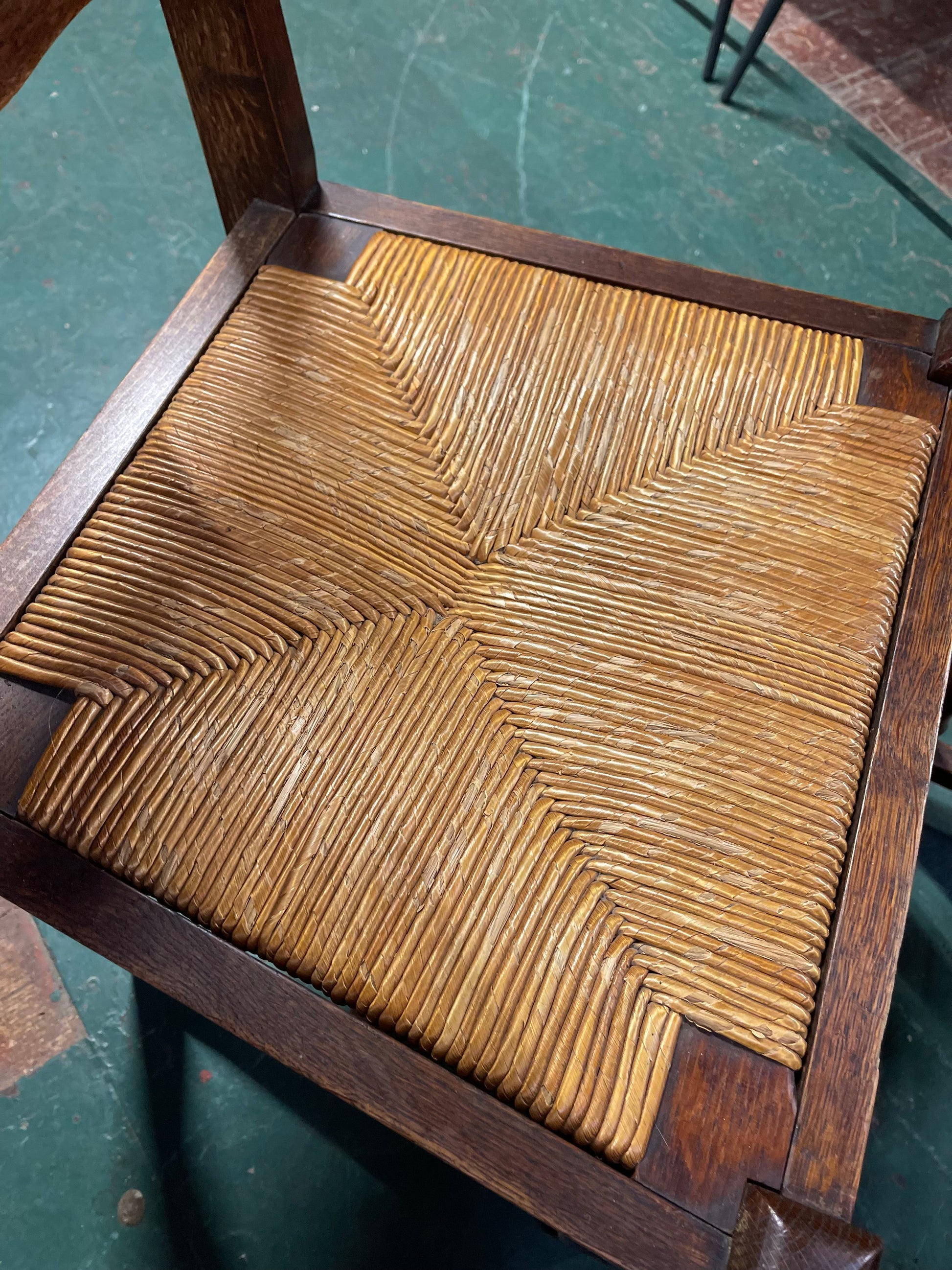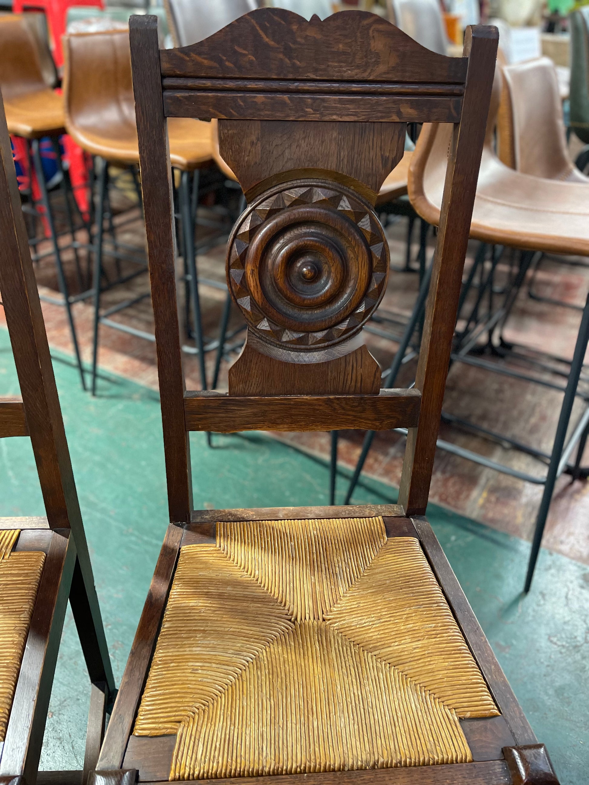 A stunning antique table and 6 chairs, originally from a chateau in Huelgoat, north-western France. We believe this dates back to the early 20th century and the level of detail on the table base and chairs backs in particular is fantastic, featuring carved wooden legs and decorative detailing that really sets it apart as a unique vintage item. The dining chairs also have a rush seat that has some light signs of wear (see photos), otherwise the chair seats are still intact and in very good condition.