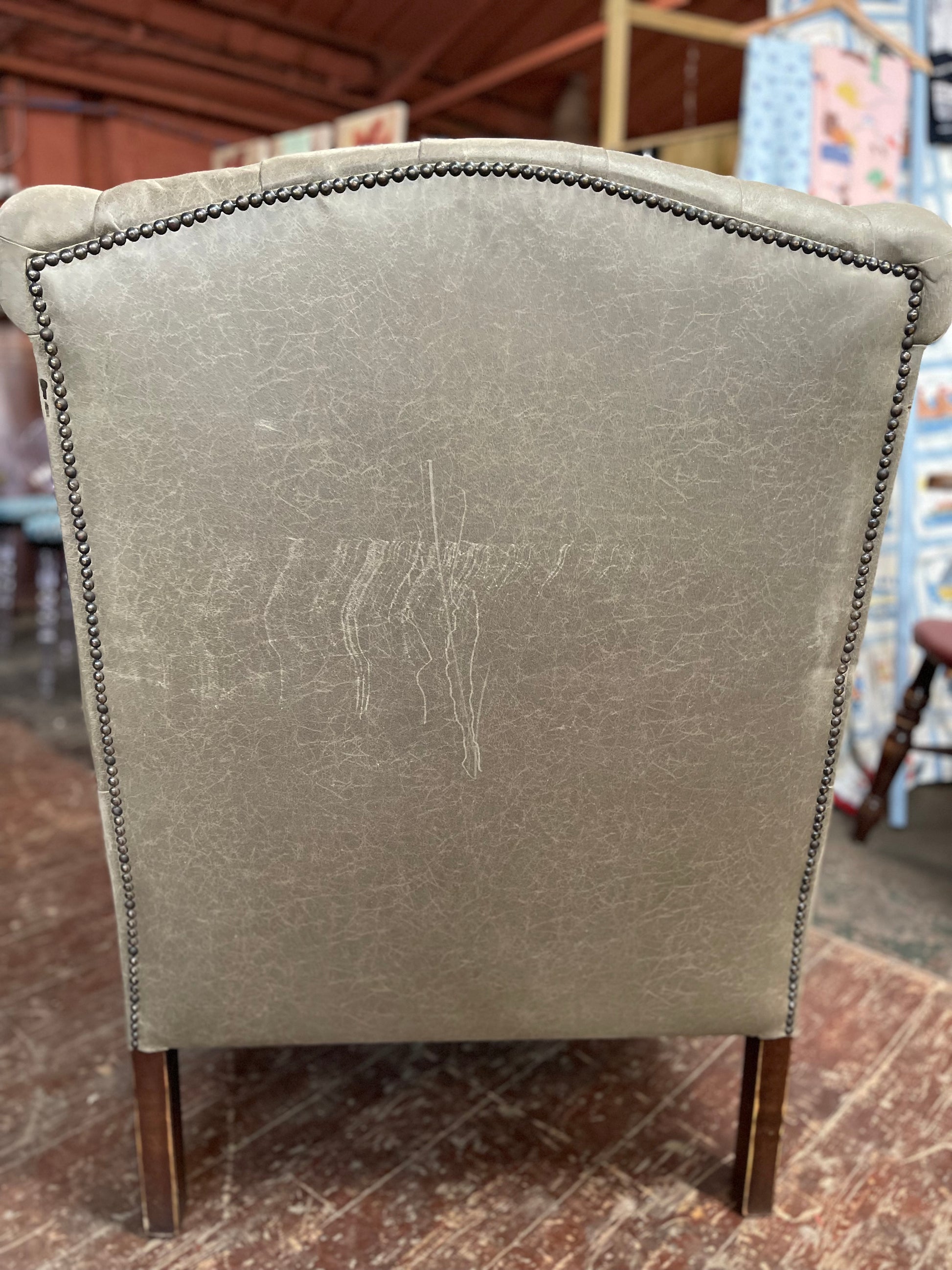 A lovely wingback armchair in a grey colour, featuring a button back rest, traditional Chesterfield-style rolled arms and brass stud detailing around the edges. Perfect for someone who is looking for a bit of vintage flair to bring to their home or pub / cafe space. Also extremely comfortable and solid!