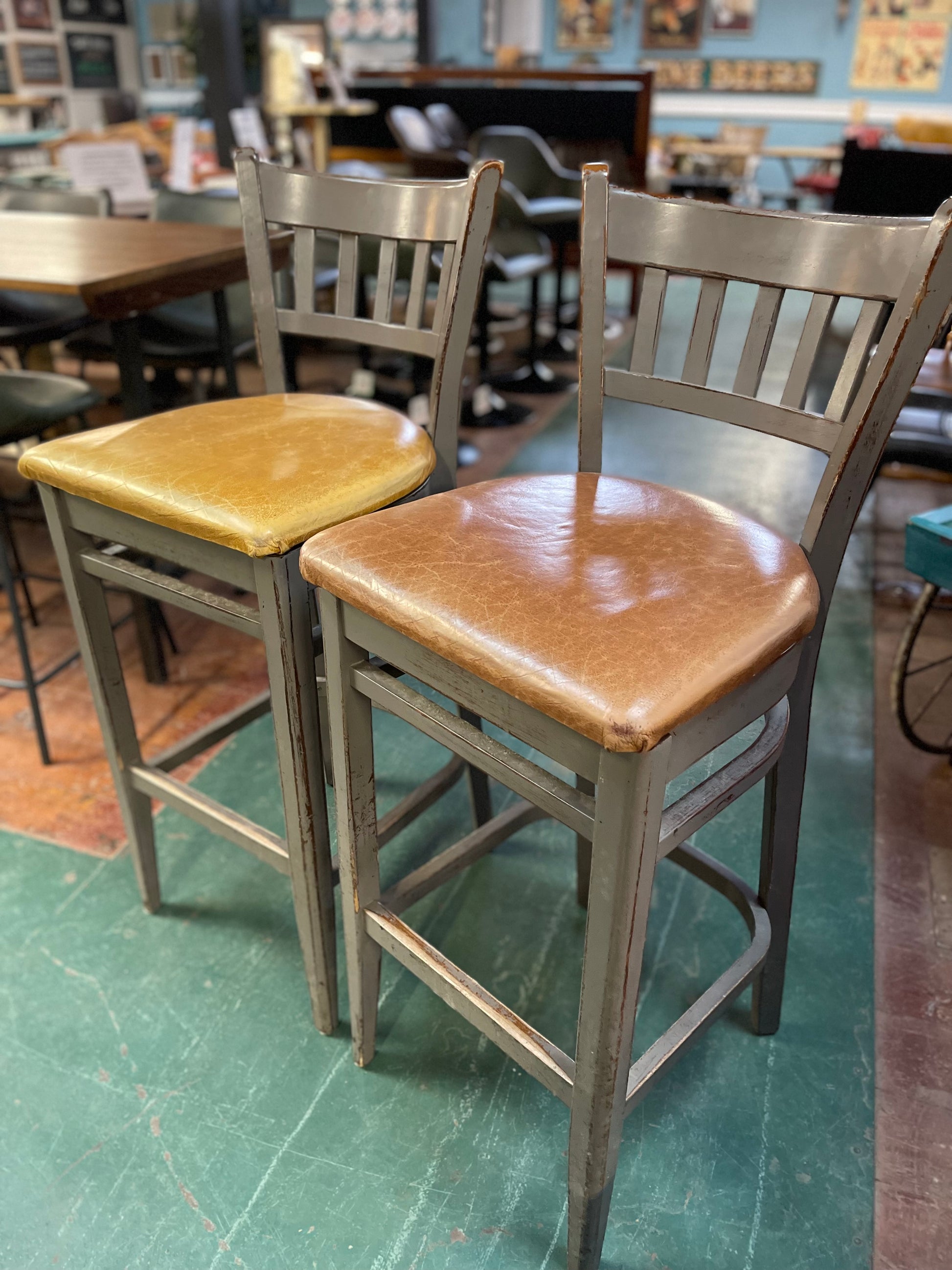 A pair of bar stools painted in a grey 'shabby chic' style, featuring real leather seat pads in slightly different tan colours. Perfect to place around a home bar or kitchen island, they're also very solid and comfortable with a low back rest.