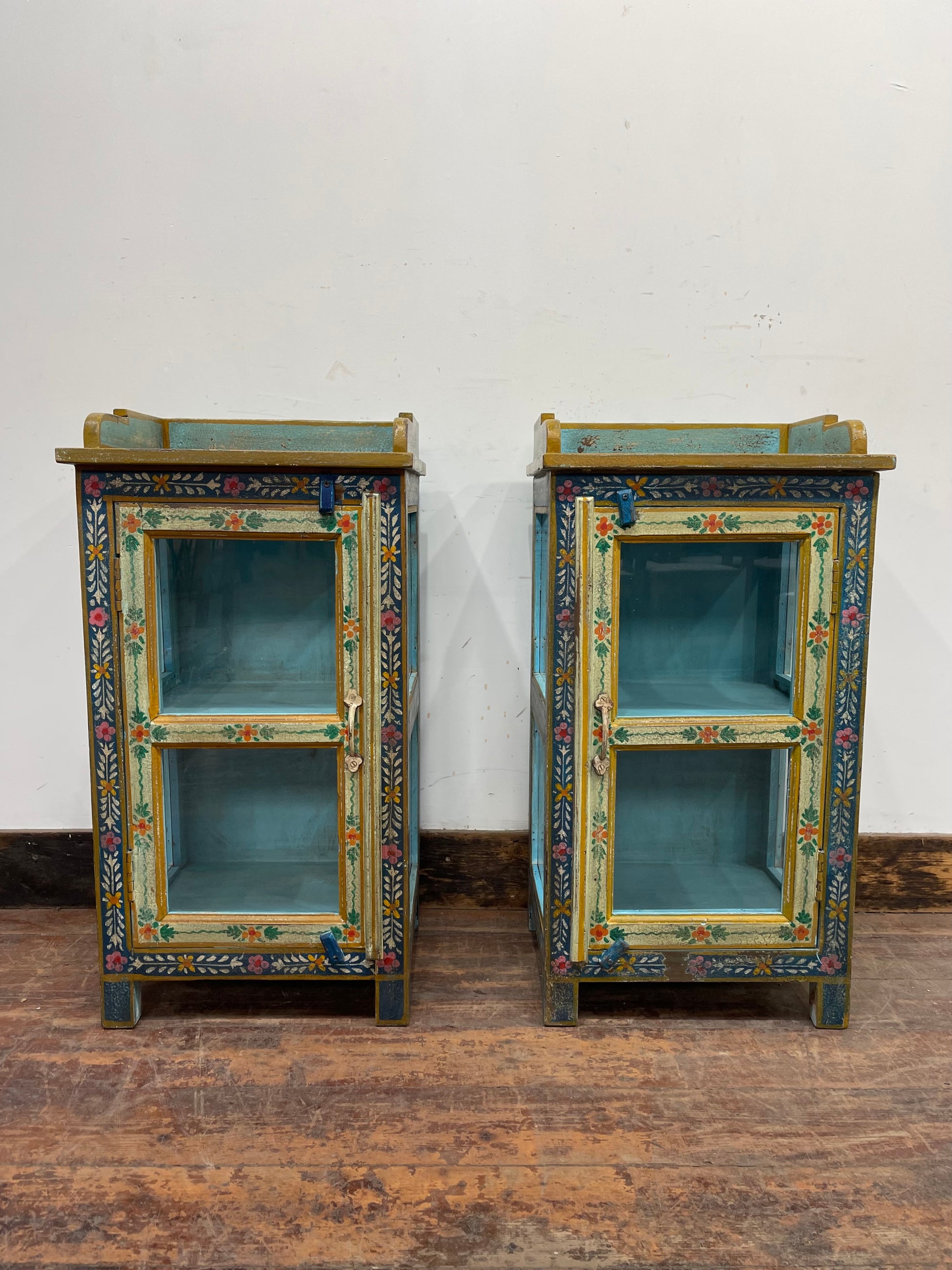 A beautiful pair of matching bedside tables / cabinets that have been exquisitely hand painted in bright colours. Featuring glass panels down the front and sides, these charming pieces would bring a splash of colour and warmth to a bedroom looking for some rustic, shabby chic charm.