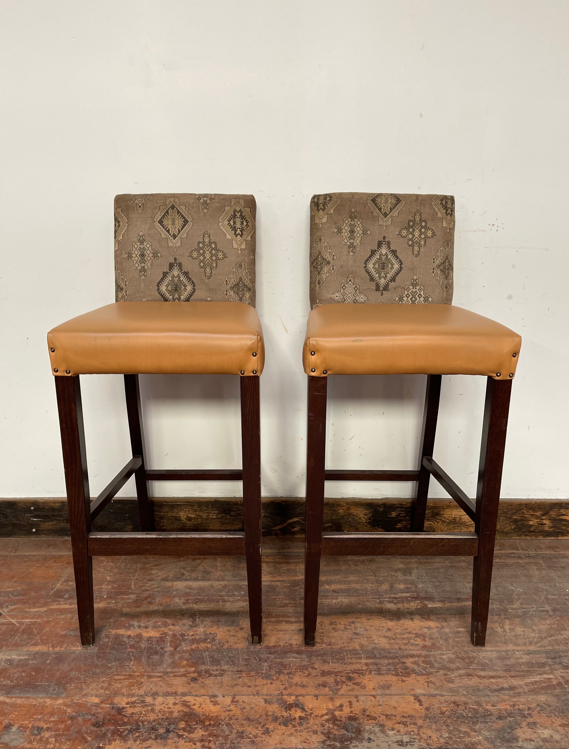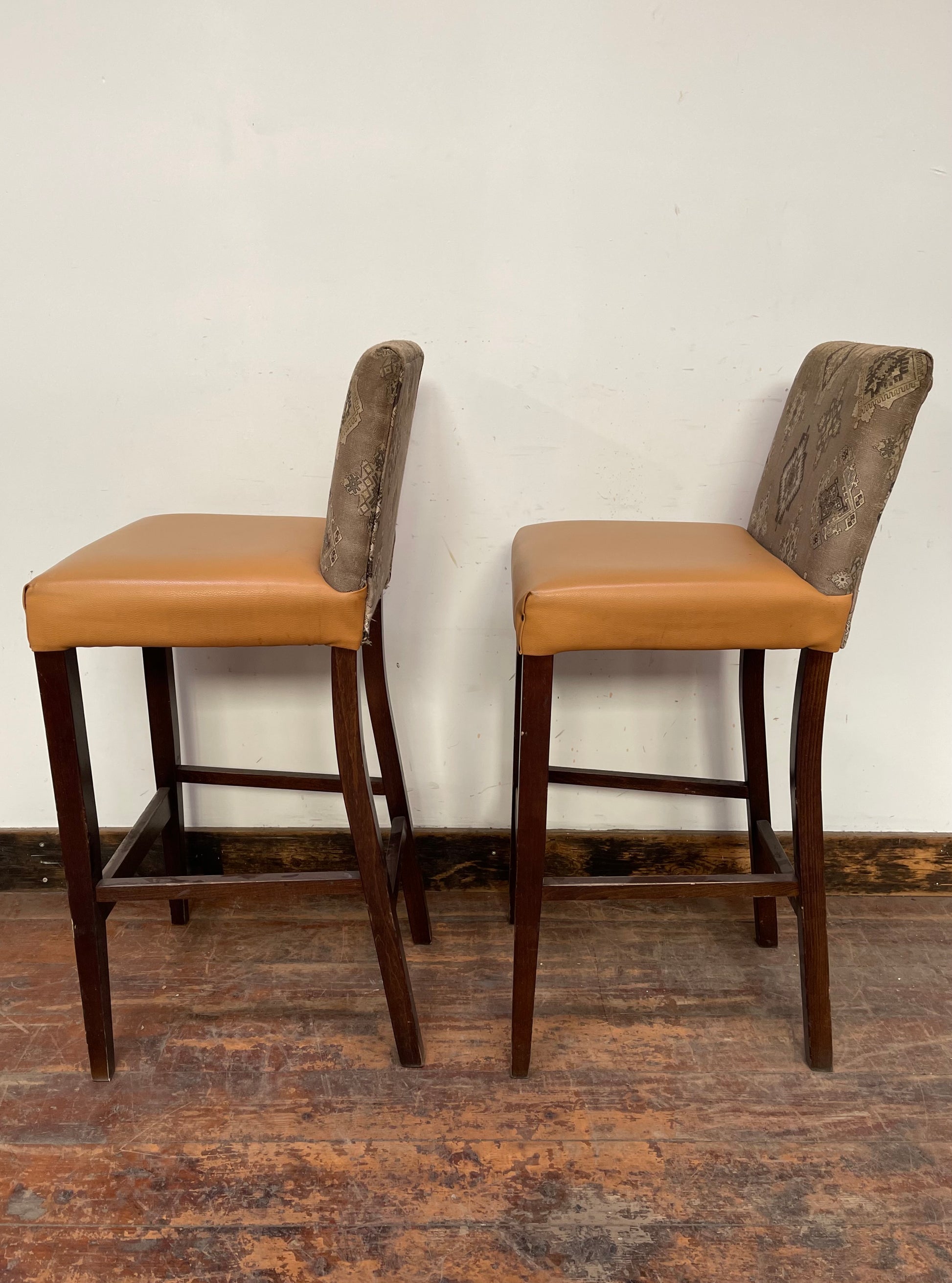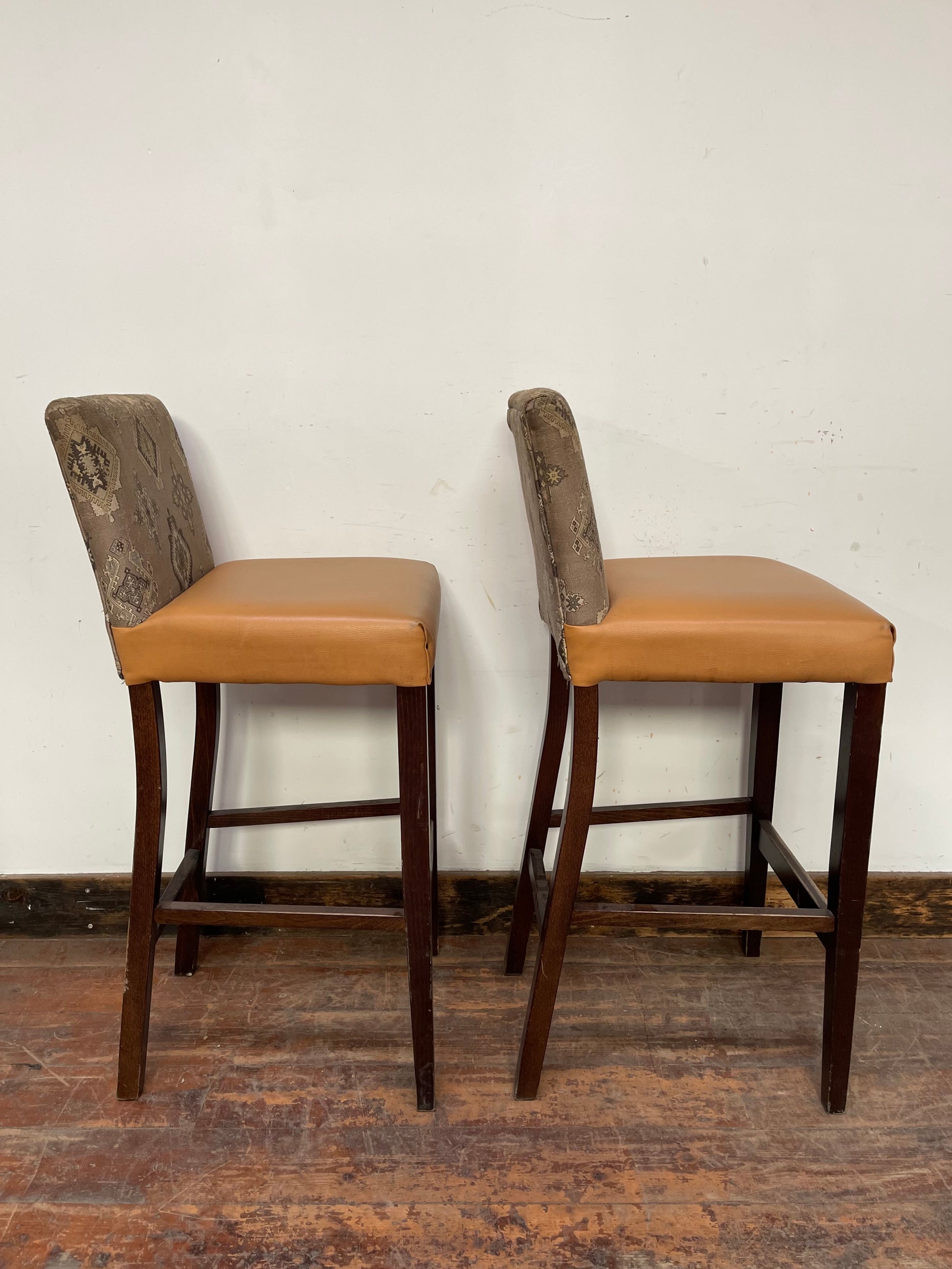 A pair of stylish bar stools featuring a mustard yellow faux leather (we think it may actually be real leather but can't say for sure), and patterned fabric back rest. Very solid and comfortable, these would be a nice bright addition to a home or hospitality space.