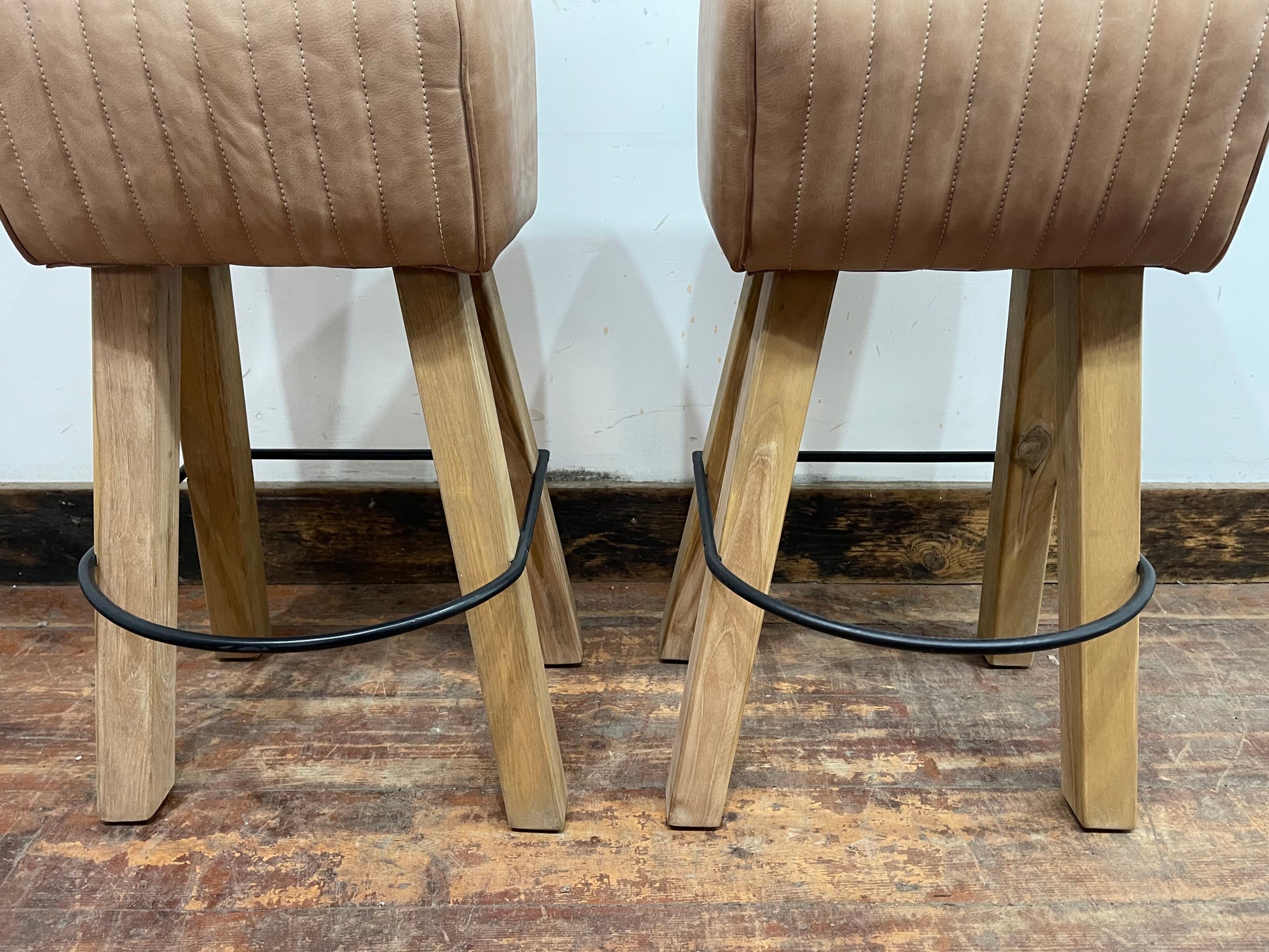 Condition report: ex-display bar stools, so there may be some small marks, however, they're in great condition overall. Additionally, please note that the leather tops and wood pattern on each bar stool may differ slightly to the ones photographed here due to the natural products used to make them (e.g. the pattern in the wood grain, etc). Some of the leather also has what appears to be a few marks / dots (see last photo for a close-up), but again, this is a result of a slight natural discolouration / texture in the leather and not because of any damage that has been incurred.