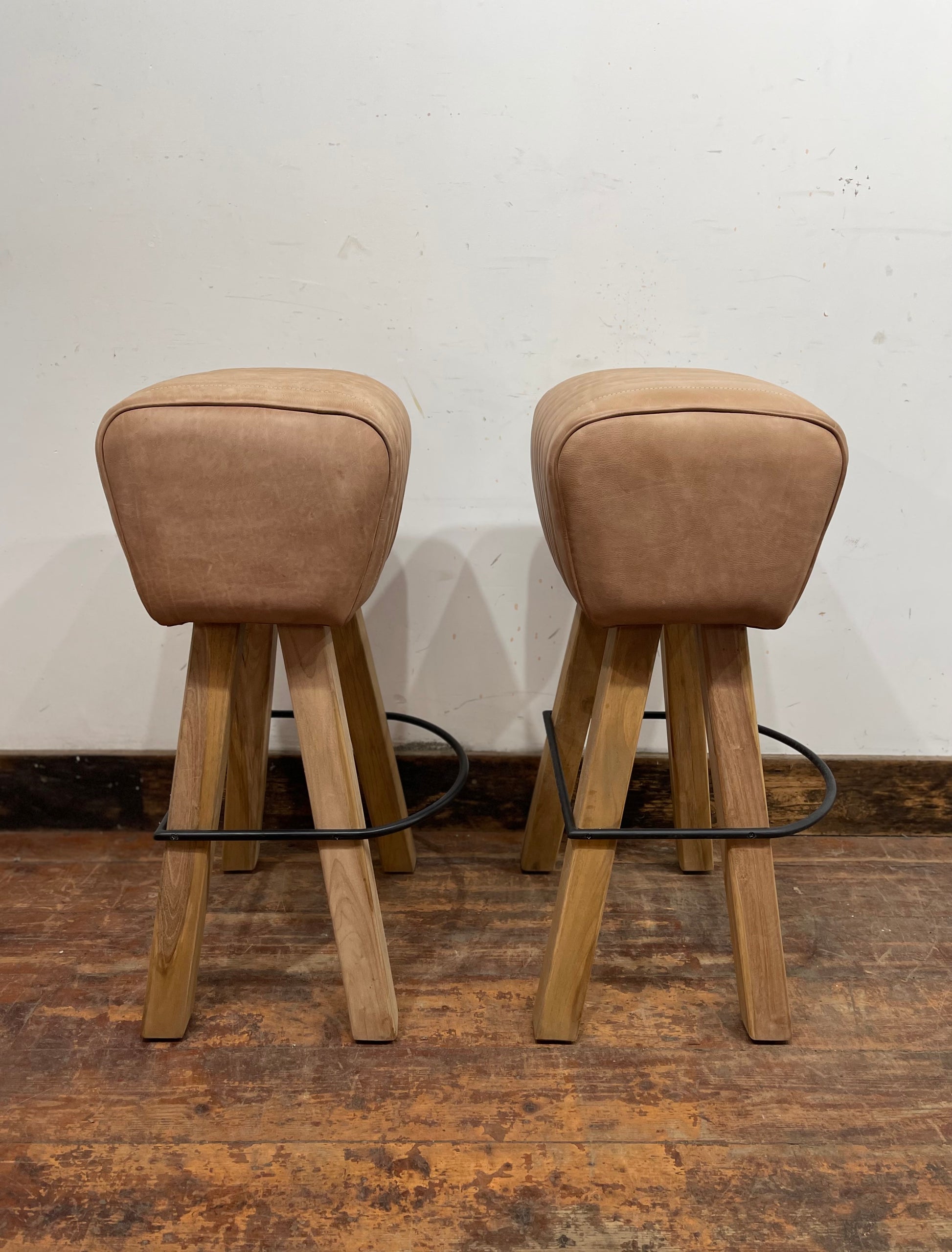 Pair of pommel stools with light tan leather seats
