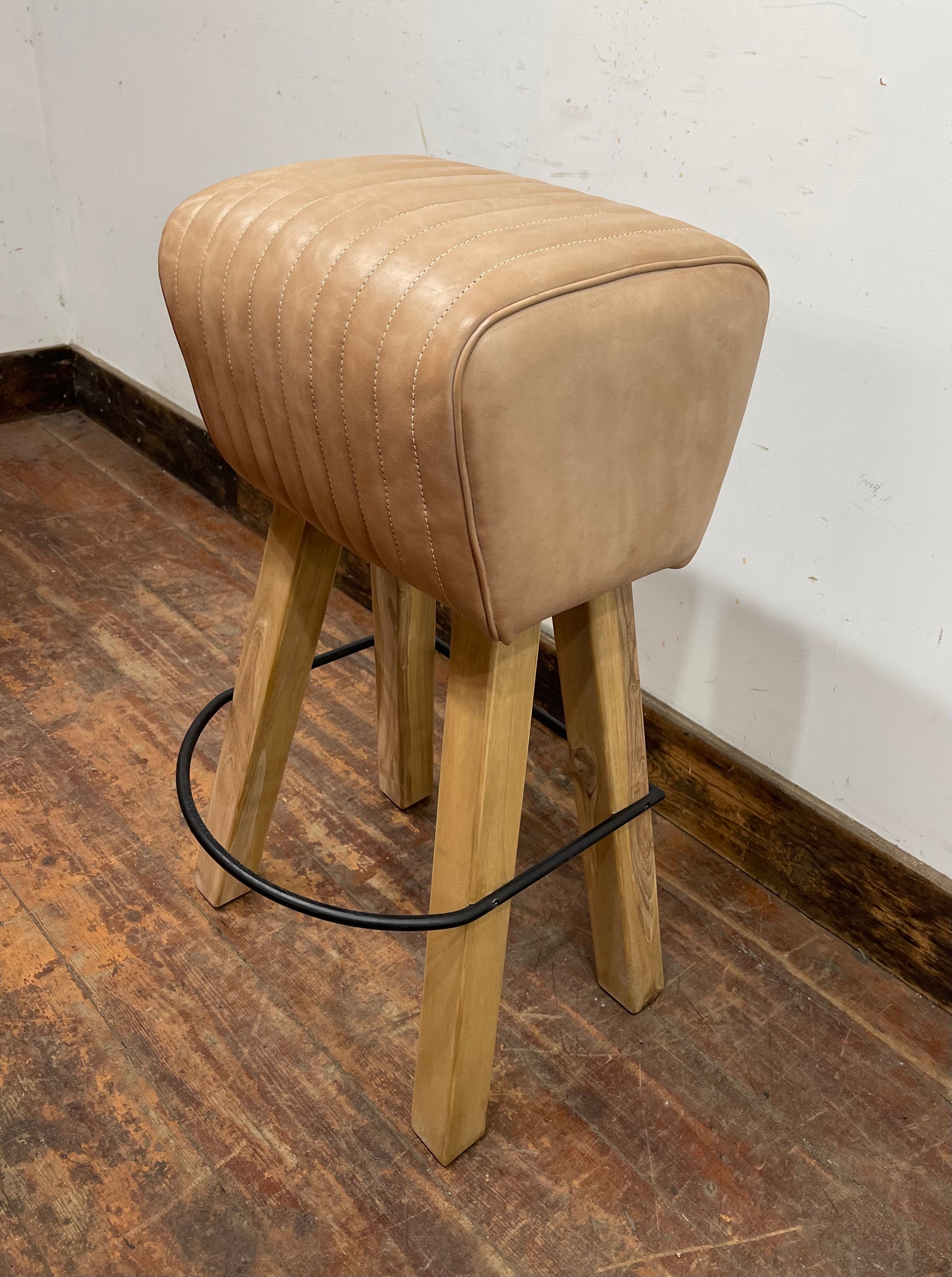 A stylish 'pommel' bar stool featuring a beautiful light tan / beige coloured leather seat and wooden legs, with a grey metal footrest. Perfect if you're looking for something a bit quirky with a retro twist.
