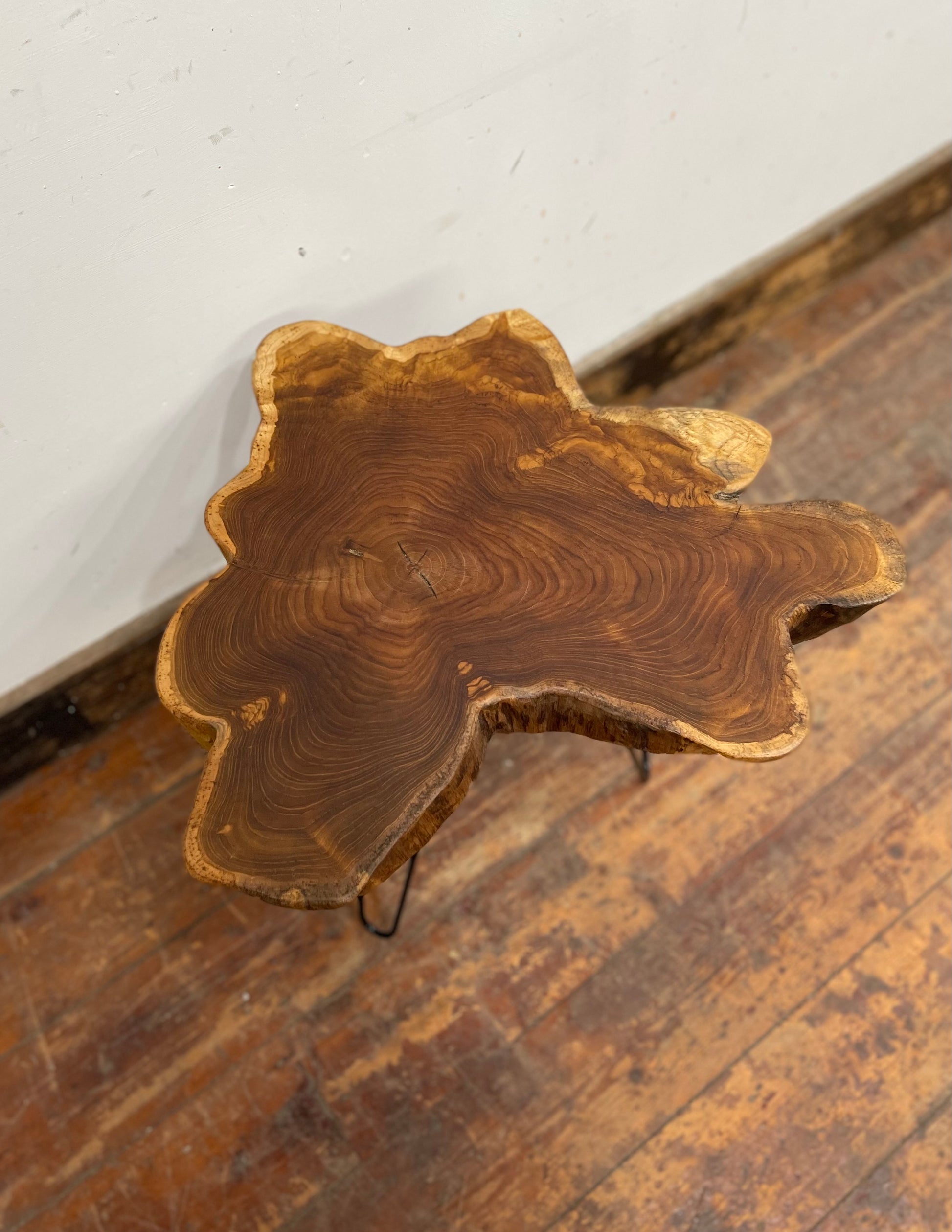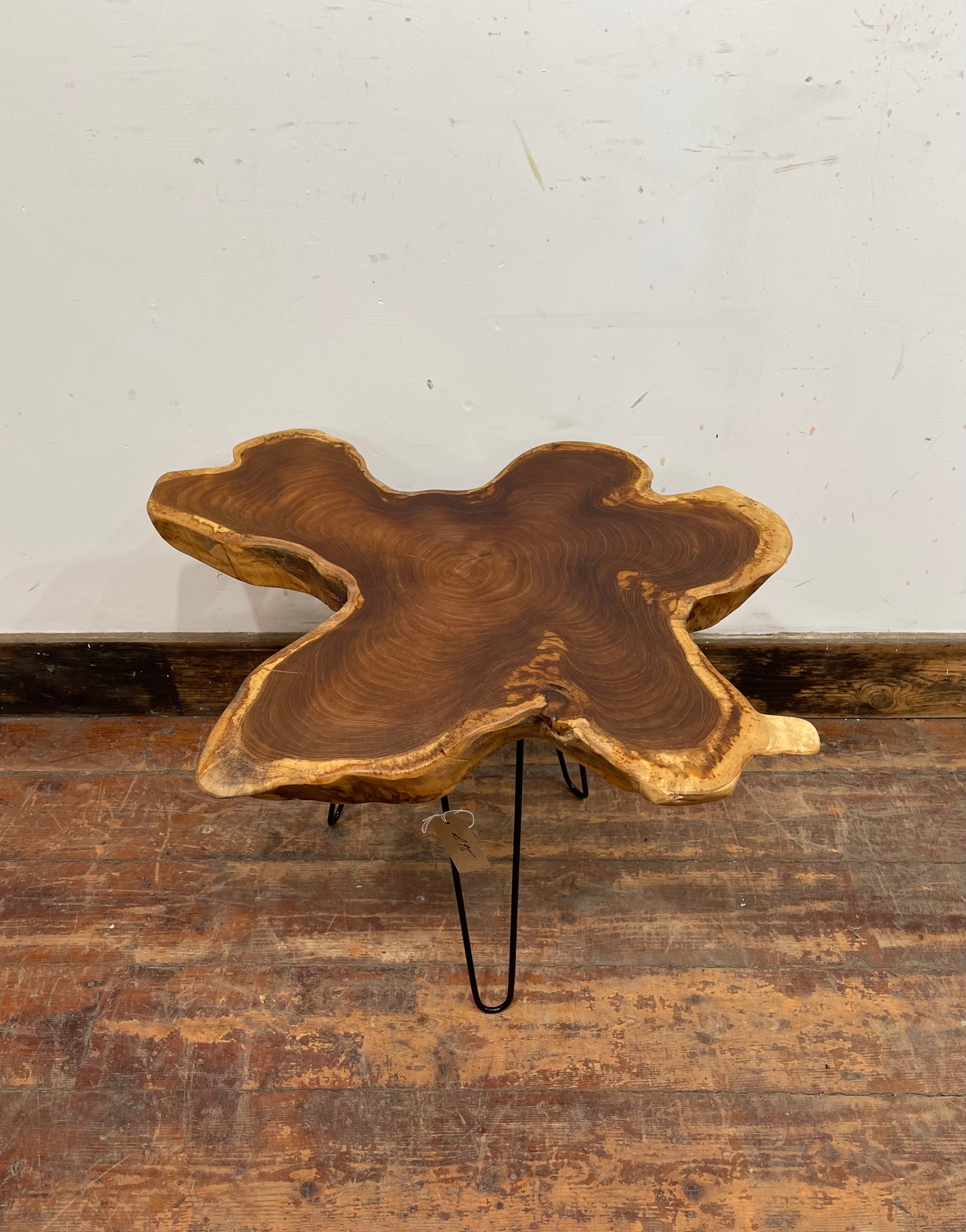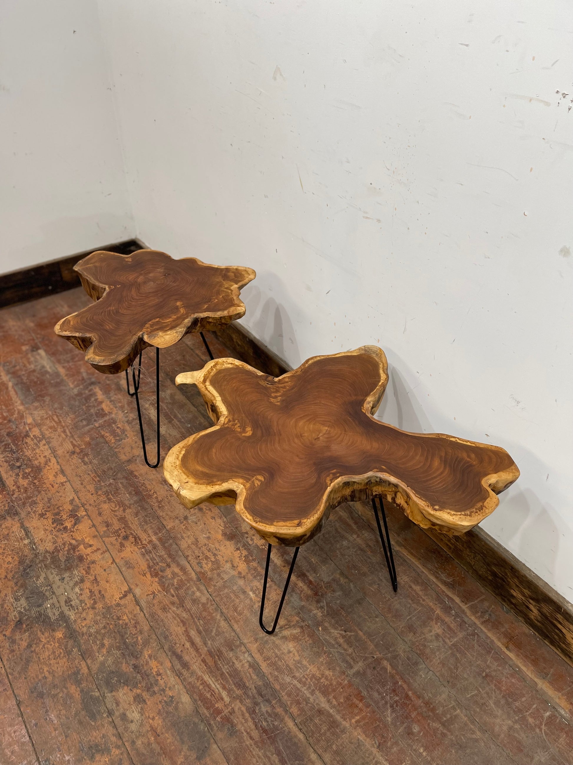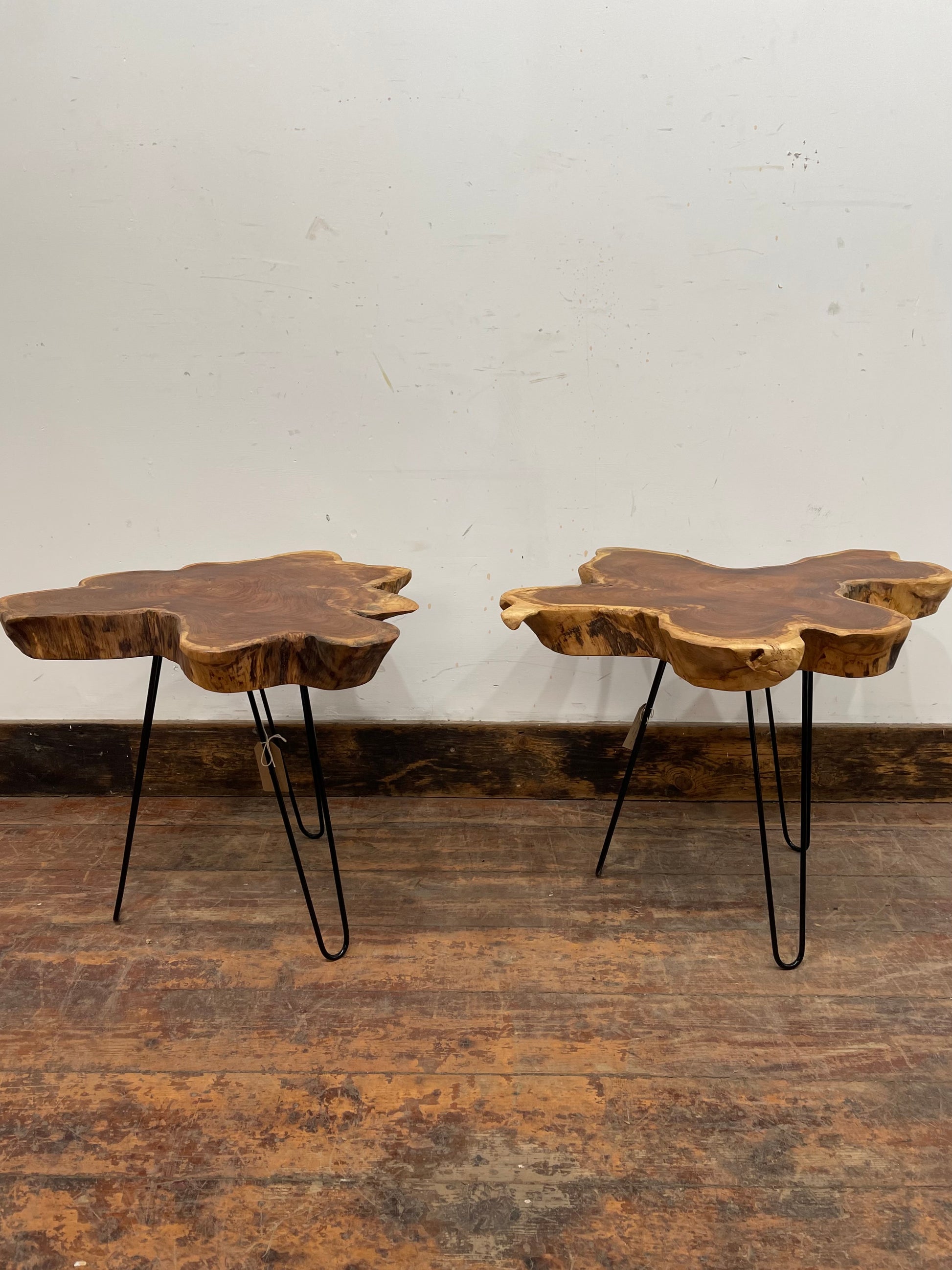A pair of beautiful and unique root wood side / end tables - no two are the same! Manufactured in Bali by a small family business and shipped over to the UK, these root wood side tables really showcase the wood's natural pattern and design to full effect, and is neatly finished by the addition of sleek and simple black metal hairpin legs.