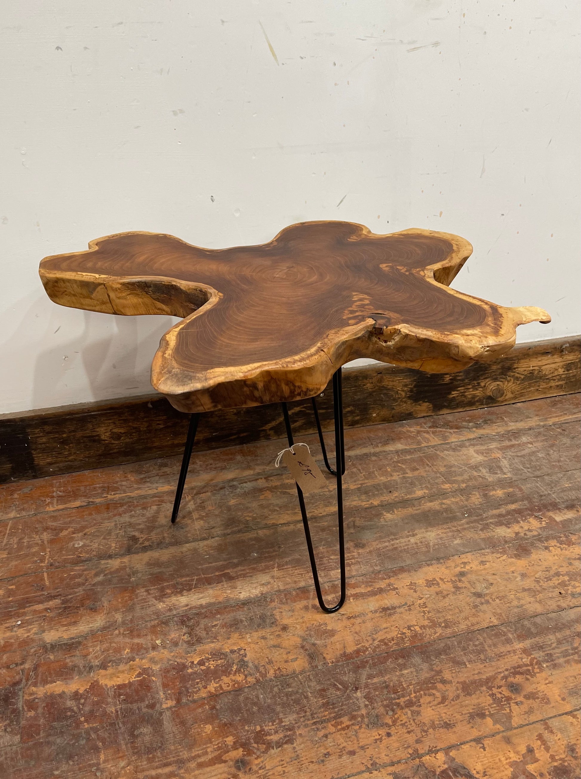 A beautiful and unique root wood side table - no two are the same! Manufactured in Bali by a small family business and shipped over to the UK, these root wood side tables really showcase the wood's natural pattern and design to full effect, and is neatly finished by the addition of sleek and simple black metal hairpin legs.