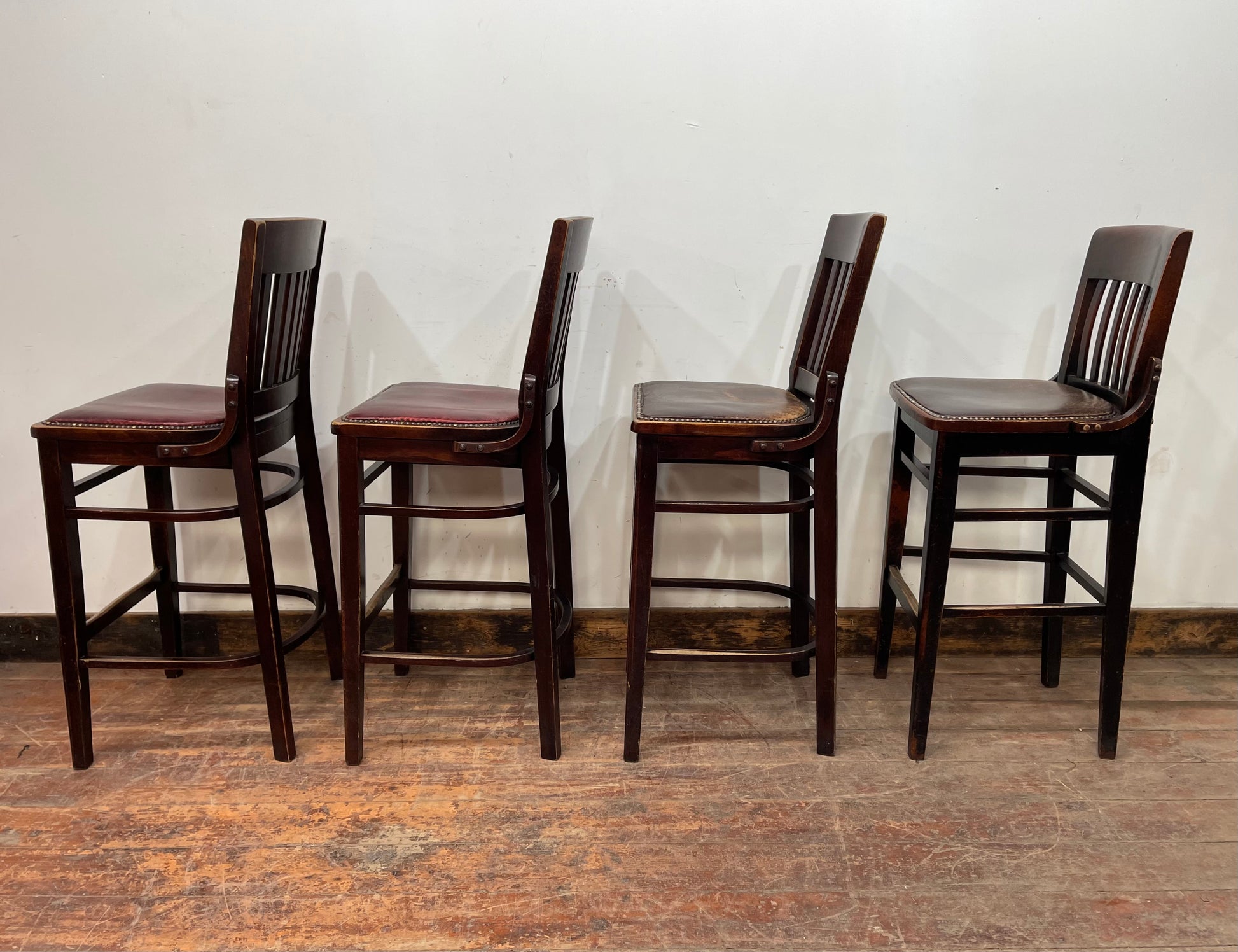 A lovely set of four traditional bar stools, featuring wooden frames and leather seat pads (two in red, two in brown) with brass stud detailing around the edge. Perfect to place in a home bar or traditional pub / bar / cafe / restaurant environment.