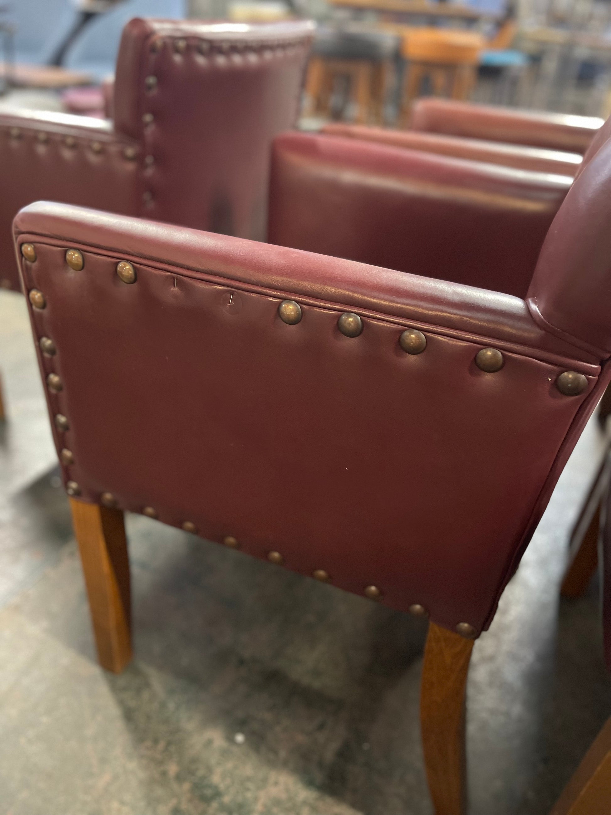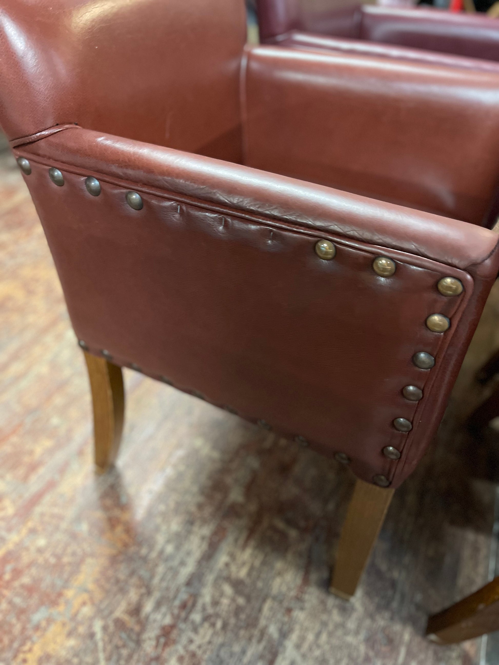 The upholstery is a leather effect / faux-leather fabric, but a good one, as the material feels very soft. There are also a few marks on the upholstery and wooden legs (see photos for close ups), and a few of the brass studs are missing from down the sides of 3 of the chairs (again, see photos). However, these chairs are in very good condition overall and have plenty of life left in them yet.
