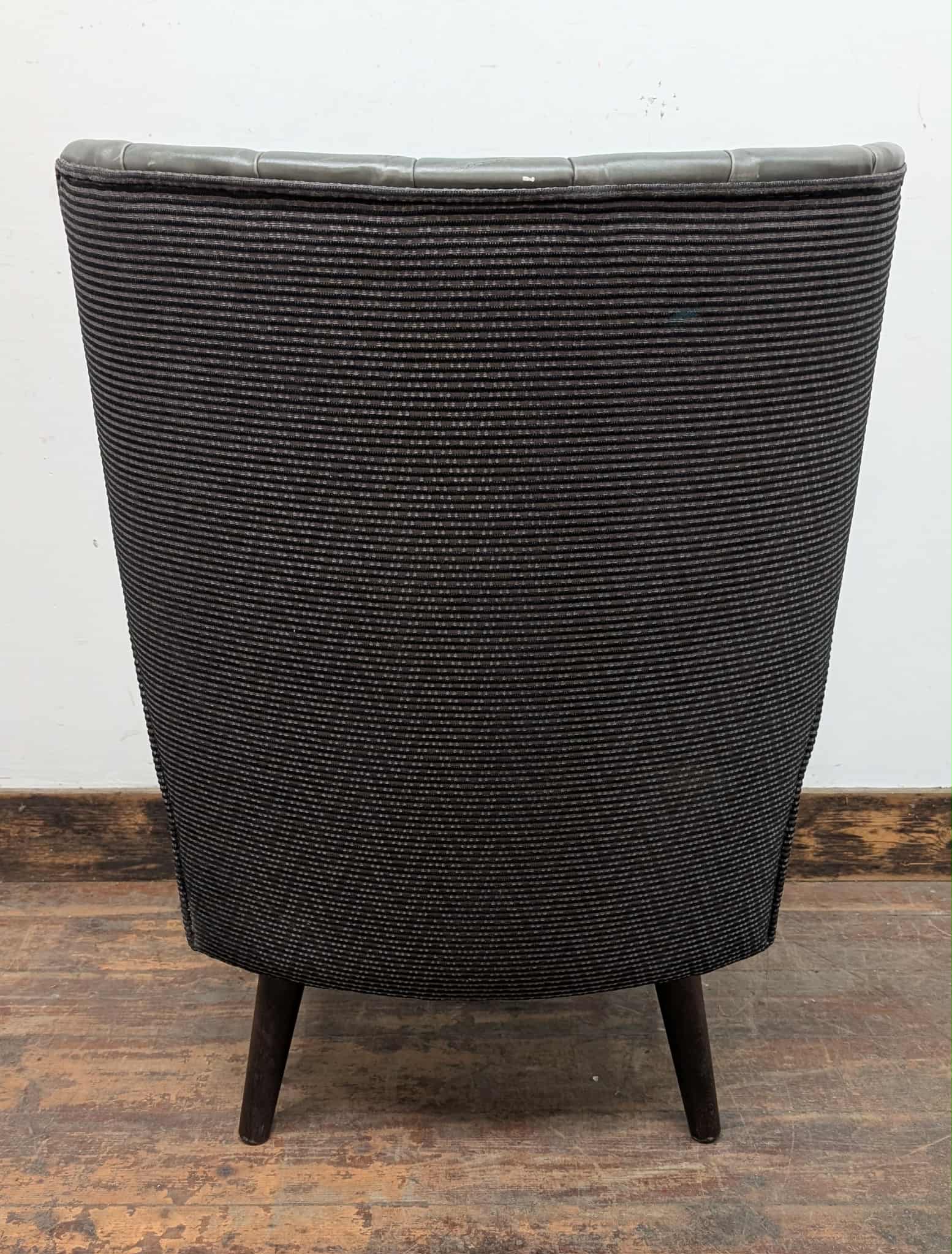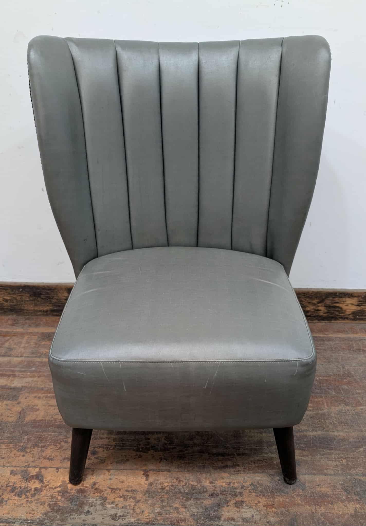 A set of eight sturdy high backed floor chairs upholstered in grey faux leather with wooden frames. Each chair also features a coarse fabric back stitched with black and white patterns. Strong and comfortable lounging chairs built to last, perfect for a break room or comfy social environment.