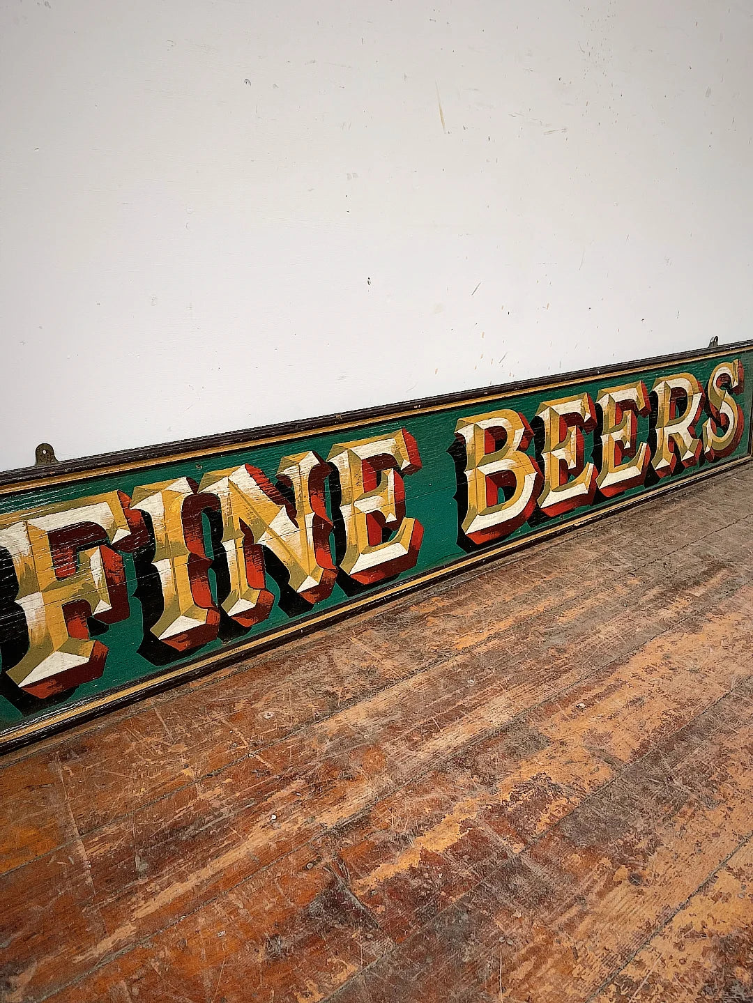 A stunning and professionally hand painted 'Fine Beers' pub sign. The level of detail applied to each letter is really outstanding and gives the wording a 3D effect. This would be perfect for a pub or home bar that's looking for some vintage / retro signage.