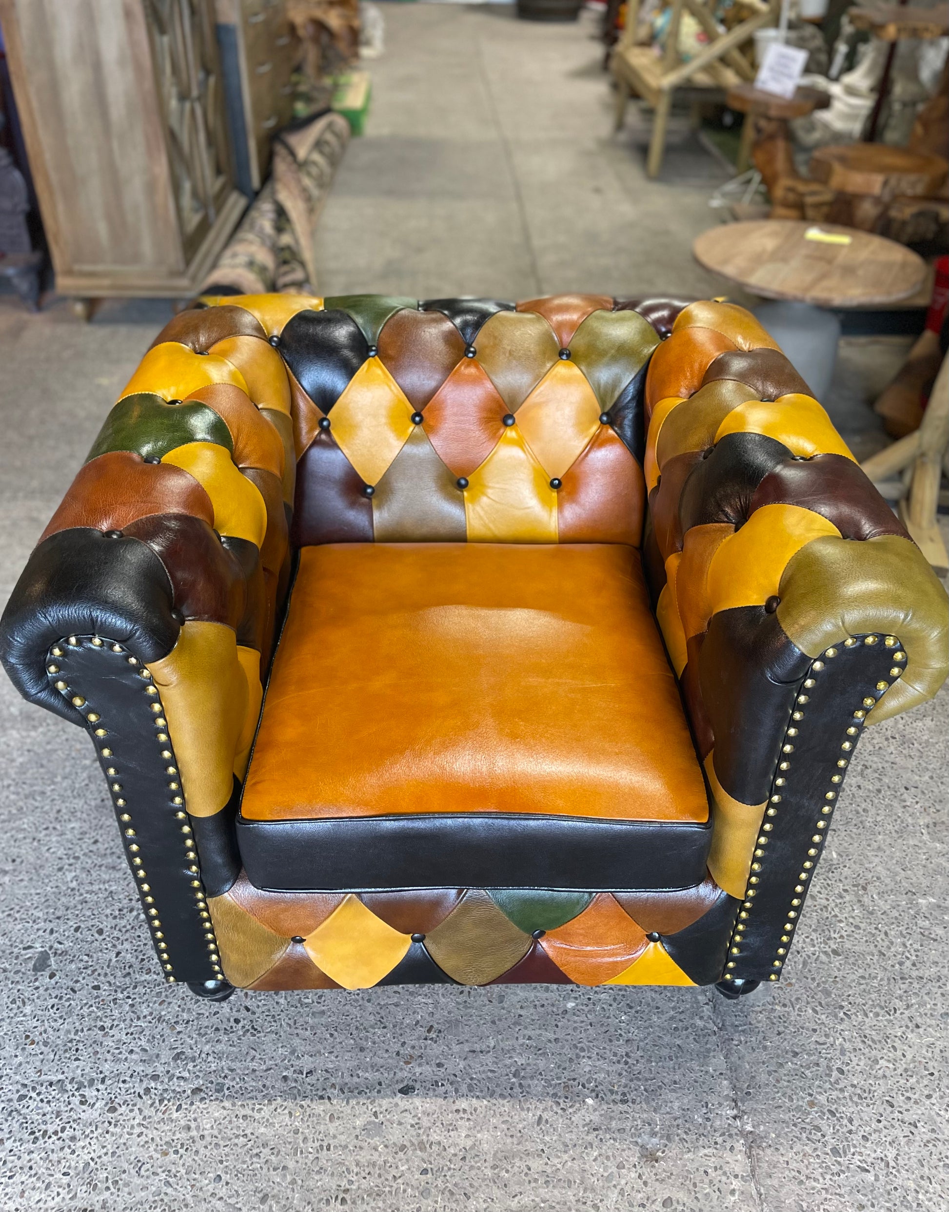 A beautiful Chesterfield style armchair, featuring a striking diamond-shaped patchwork pattern with different coloured leather patches, a button back and sides, and brass stud detailing down the front. It also has the added bonus of extremely very solid and comfortable!
