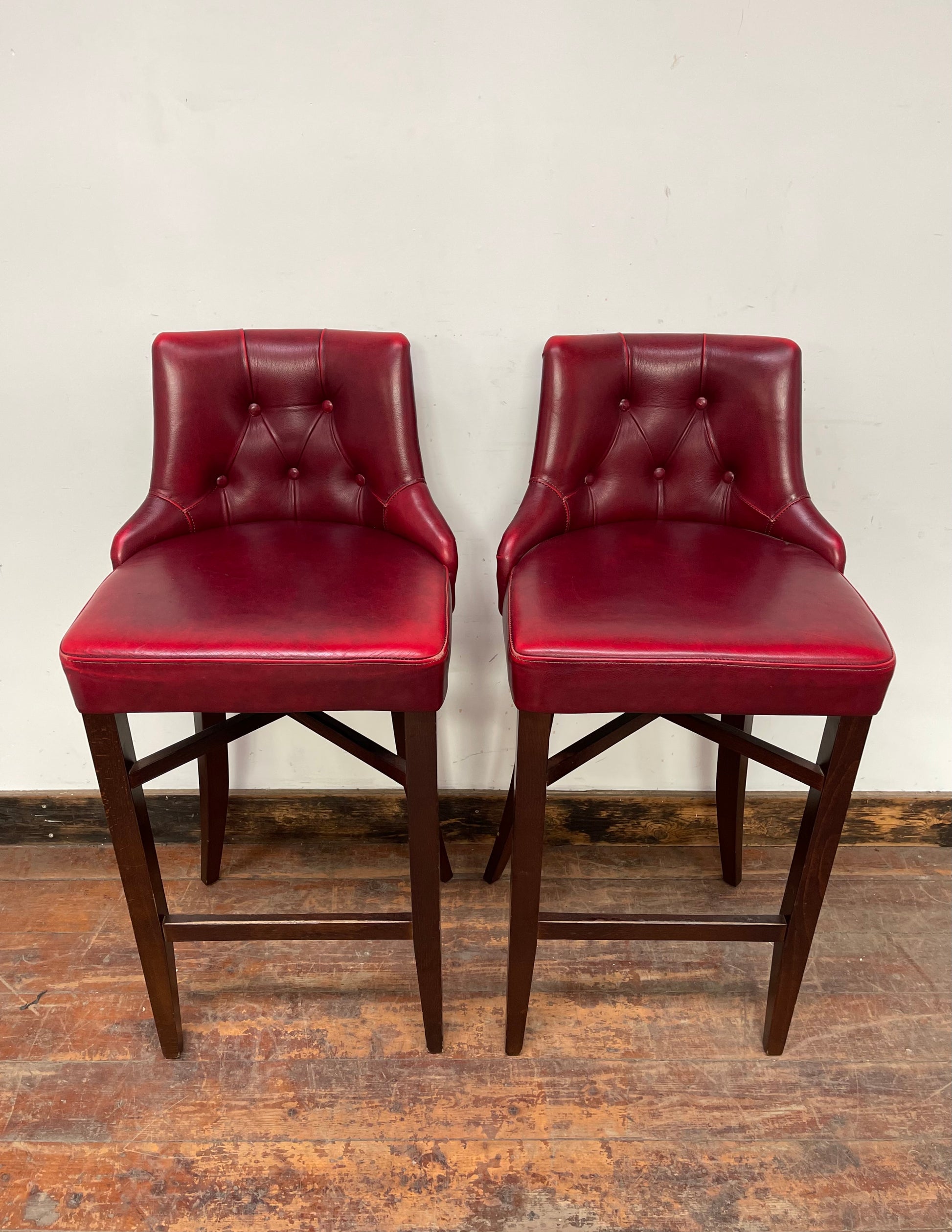 A set of 6 stunning bar stools upholstered in a vibrant red leather, featuring a button back detail and dark wooden legs. Extremely comfortable and solid, these would look amazing in a home bar or pub / cafe / restaurant space.