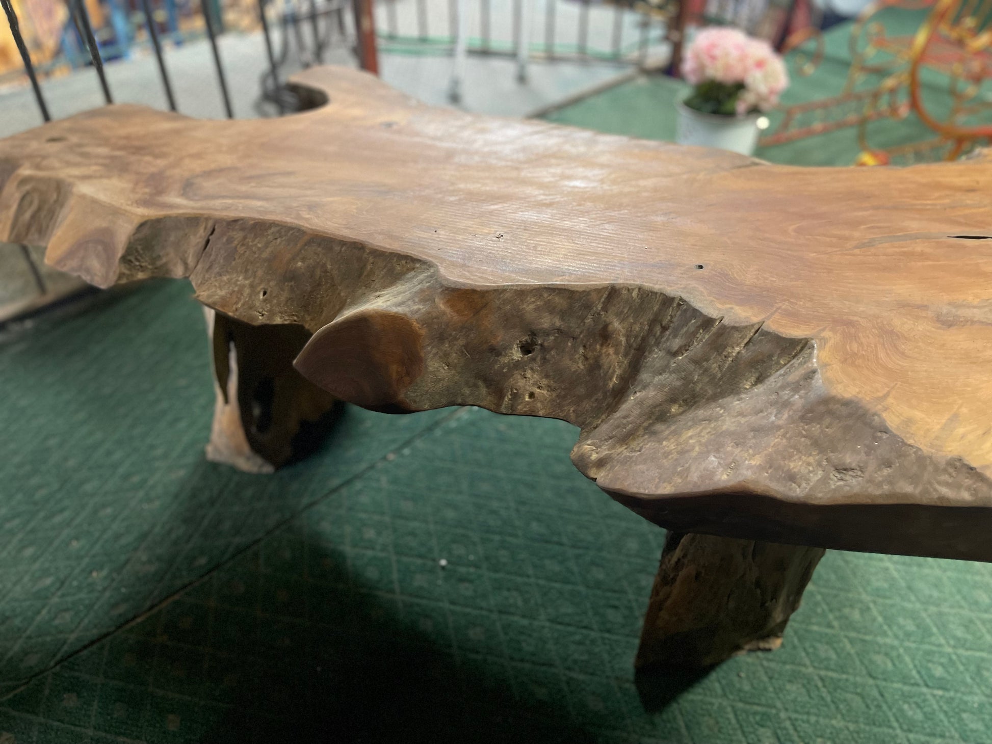 A beautiful root wood coffee table with two legs, which has been hand carved from teak root by Indonesian craftsmen.