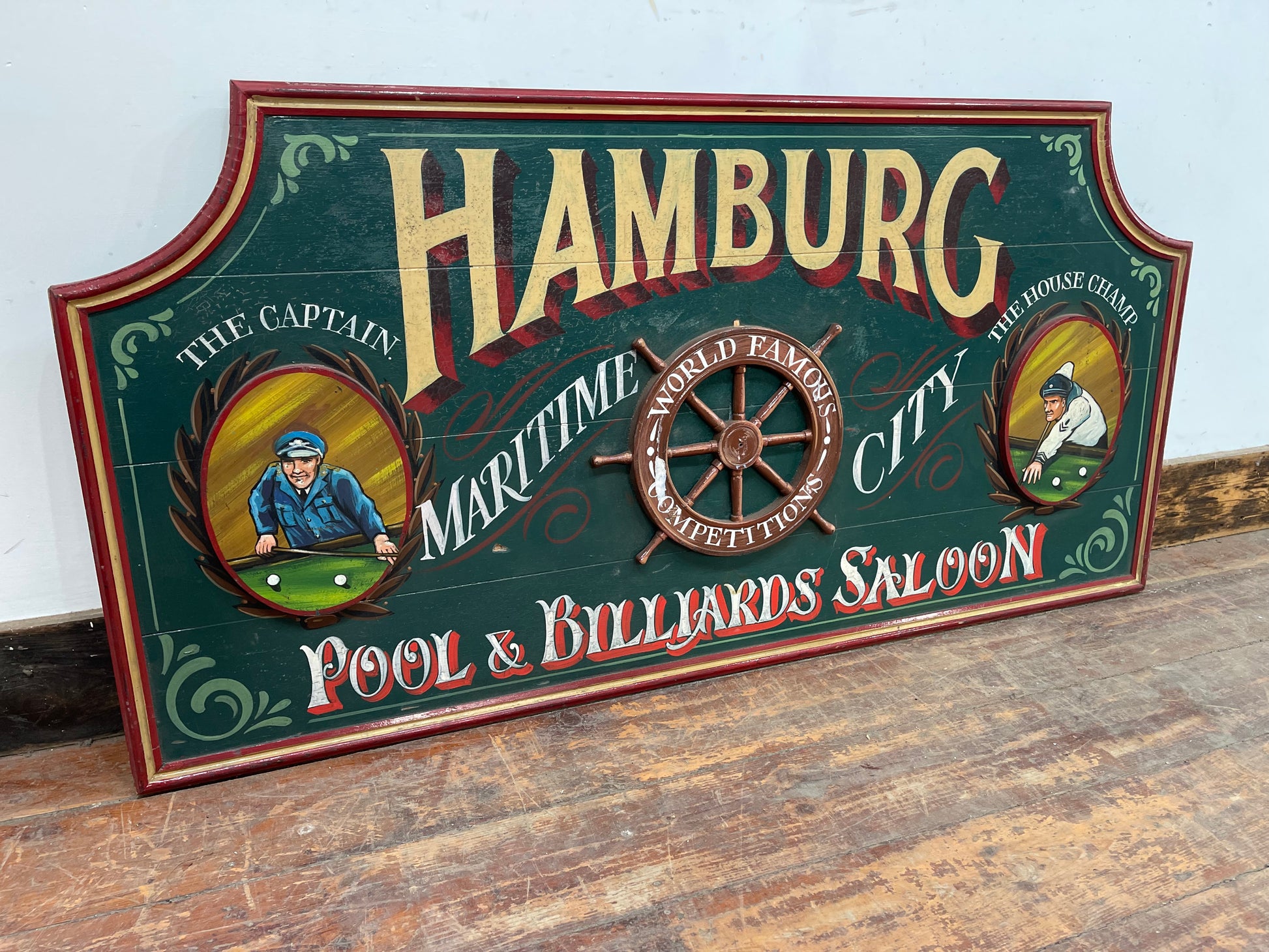 A beautiful hand painted vintage sign, truly one of a kind! We believe this sign - and a matching one (see separate listing) - came from a Liverpool pub that has since closed down and was called The Old Hamburg. Featuring a beautifully designed ship's wheel / helm with a 3D effect, this is perfect for anyone who loves a nautical theme, or pub and / or pool related! It would look fantastic hanging up in a home or hospitality space.