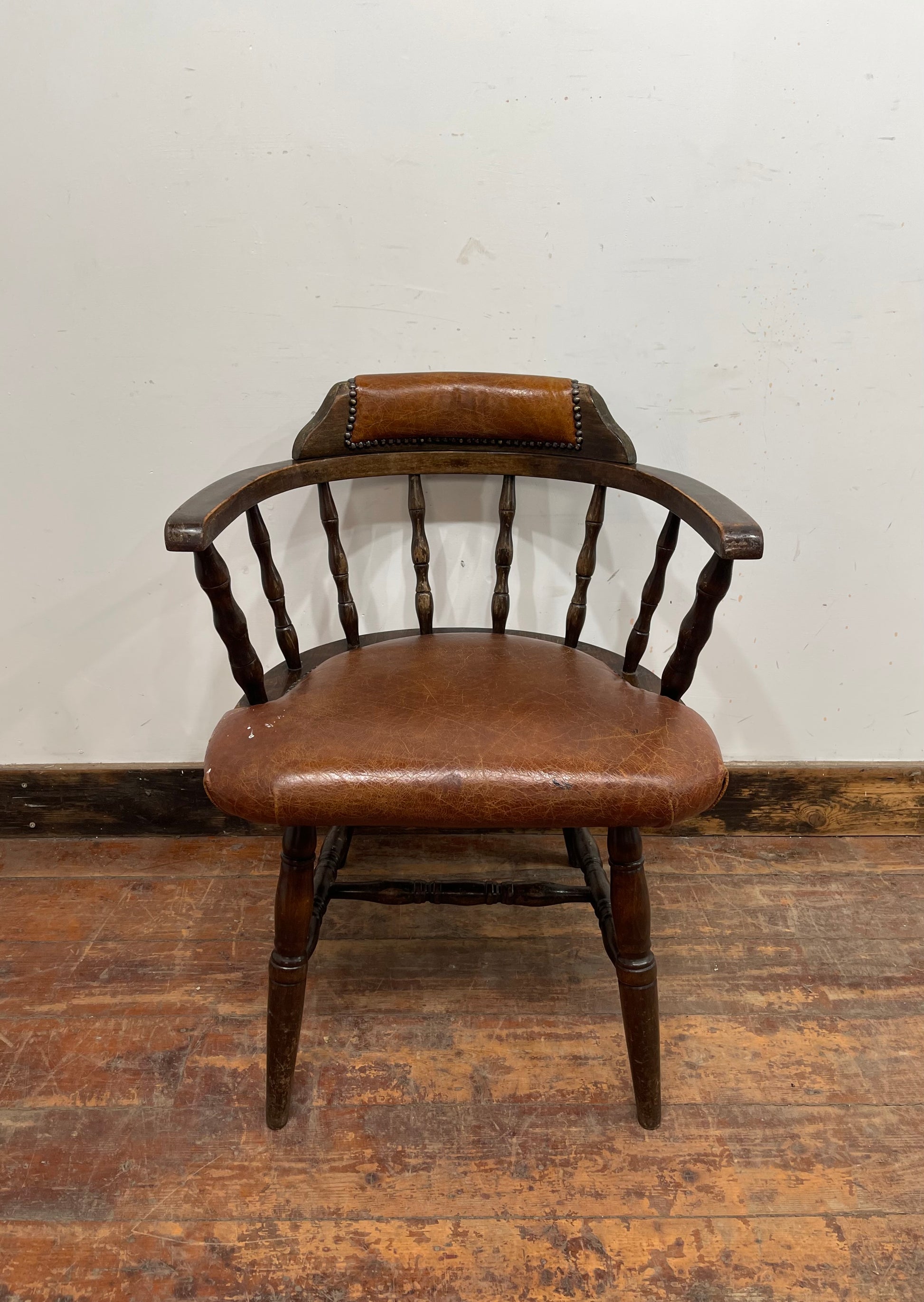 A lovely item in a vintage style: this chair would be perfect for use in an office or to have as an accent chair in a living / dining room area. Featuring a decorative wooden frame with spindle back detailing, in addition to leather upholstery on the seat, chair arms and back rest, complete with brass studs.